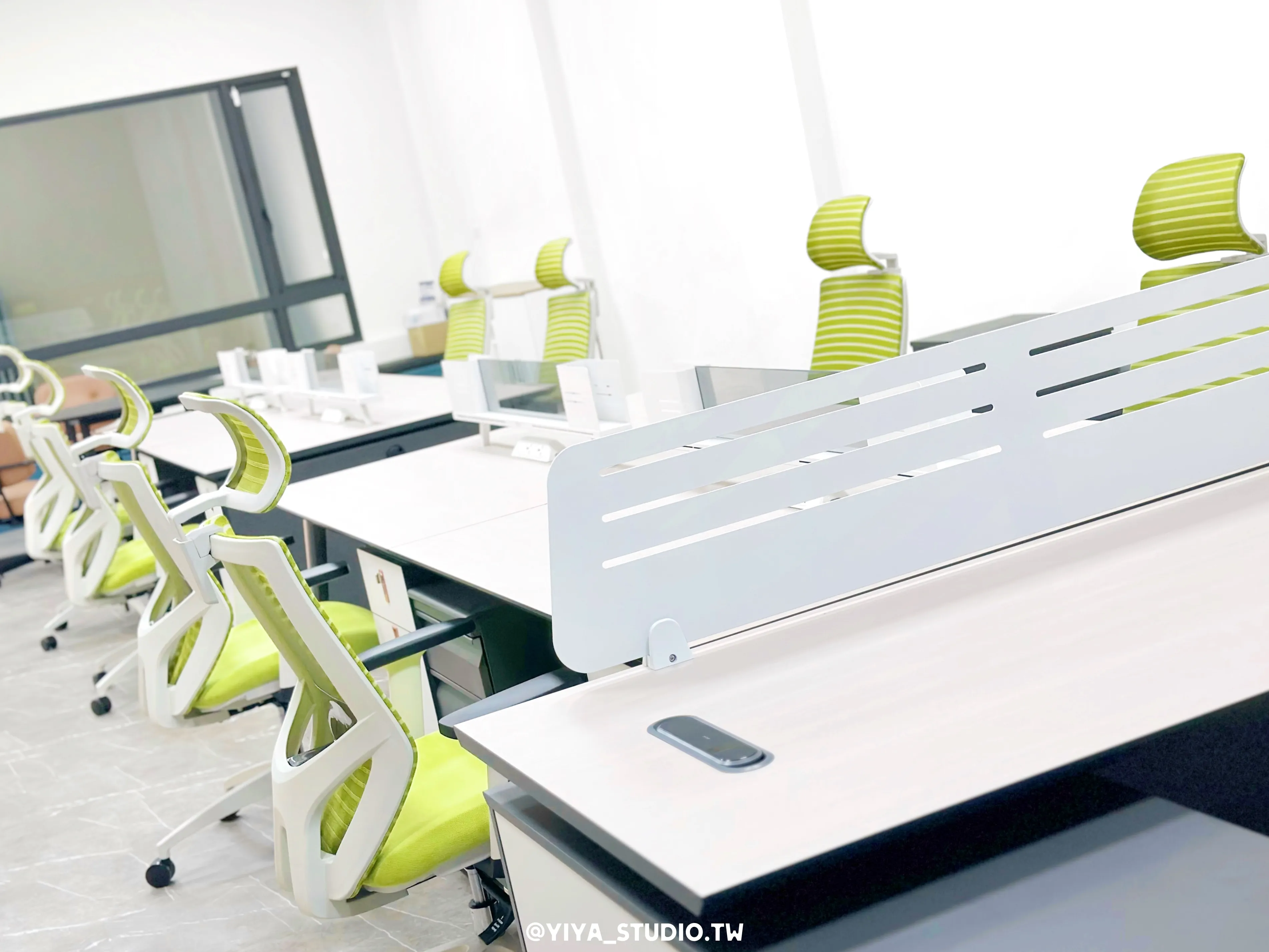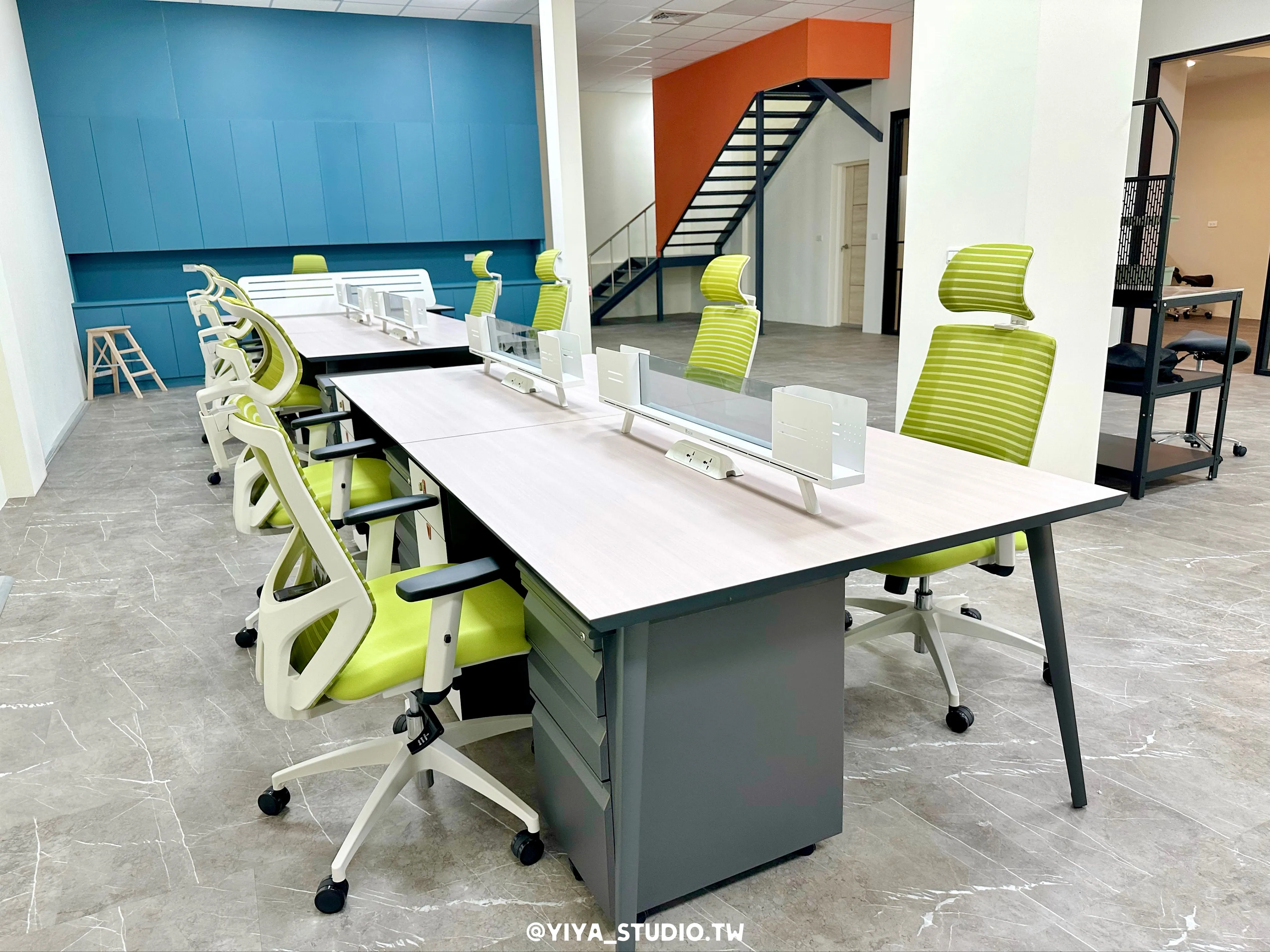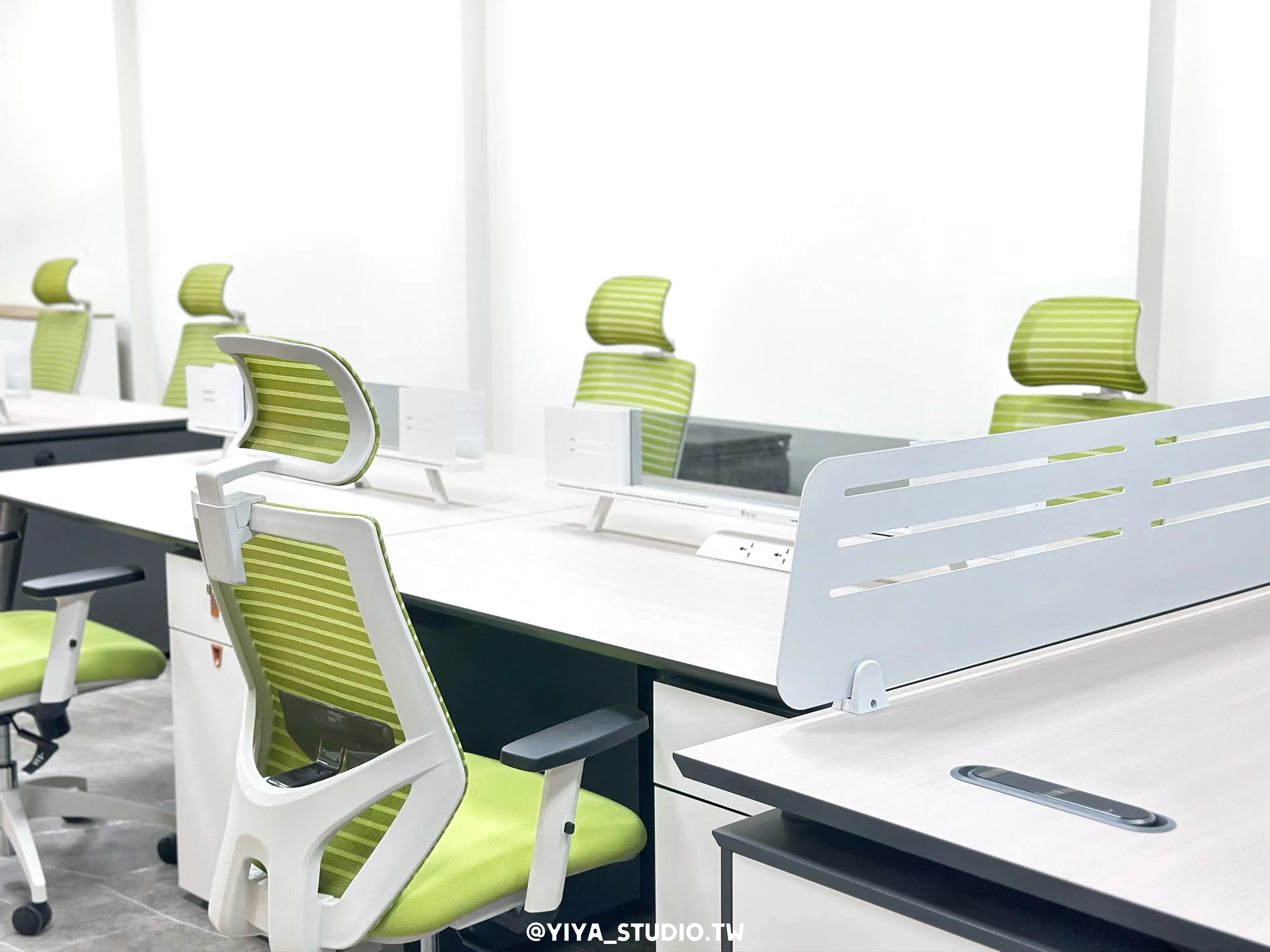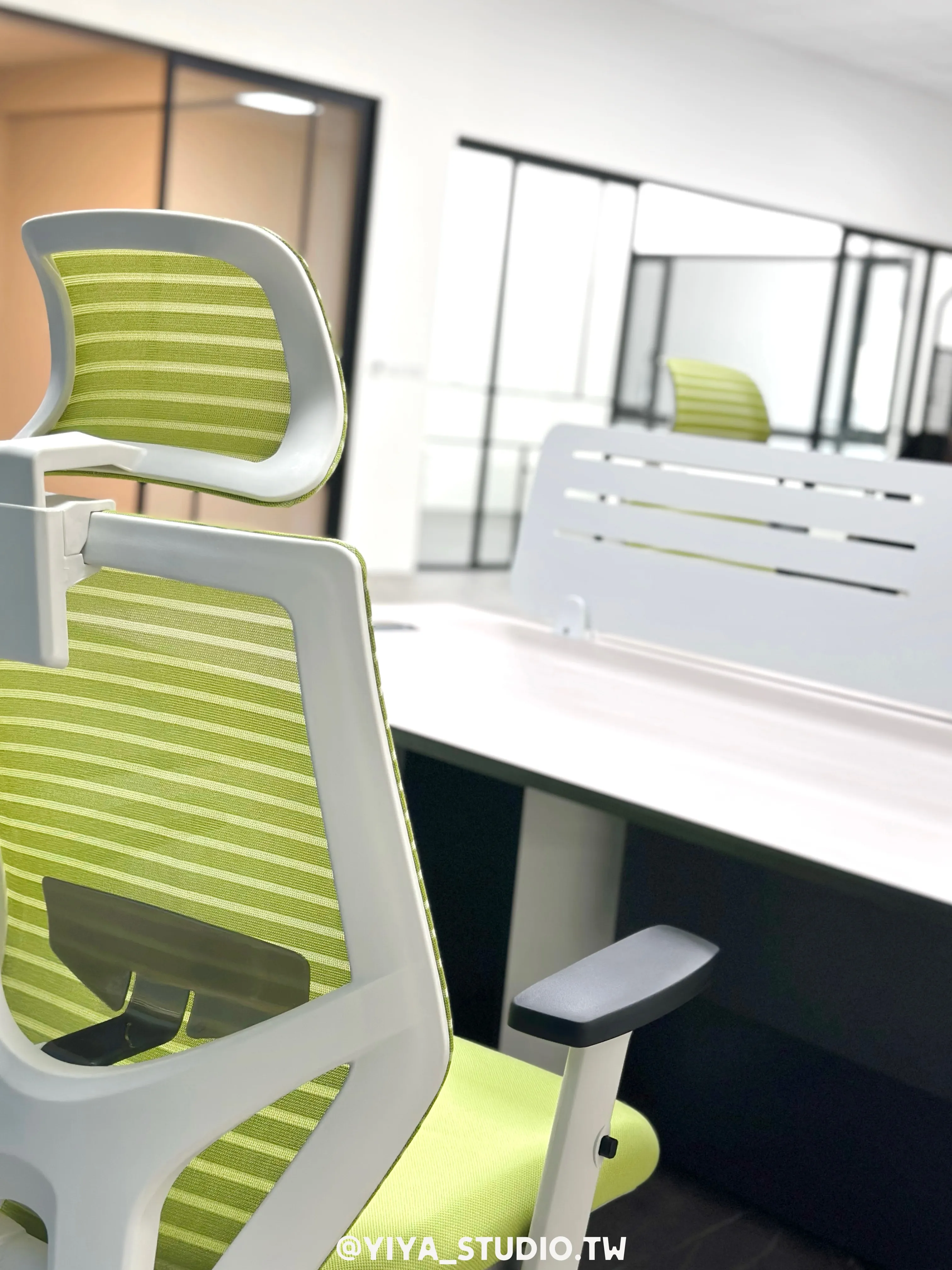 人體工學椅選用F-type系列,以綠色點綴空間視覺,提升長時間久坐的舒適度;主管桌與職員開放工作站採同系列設計,維持整體空間一致性。