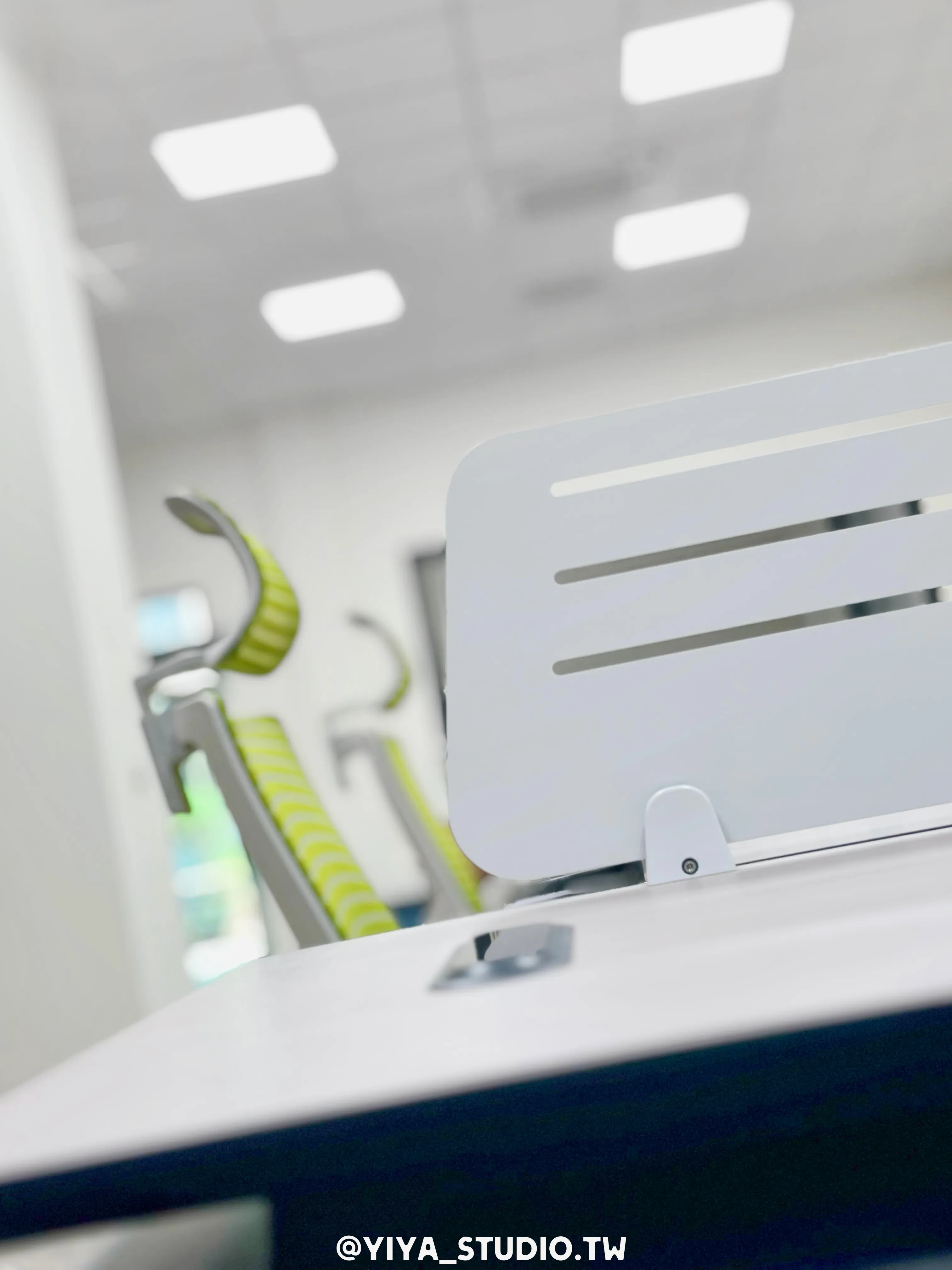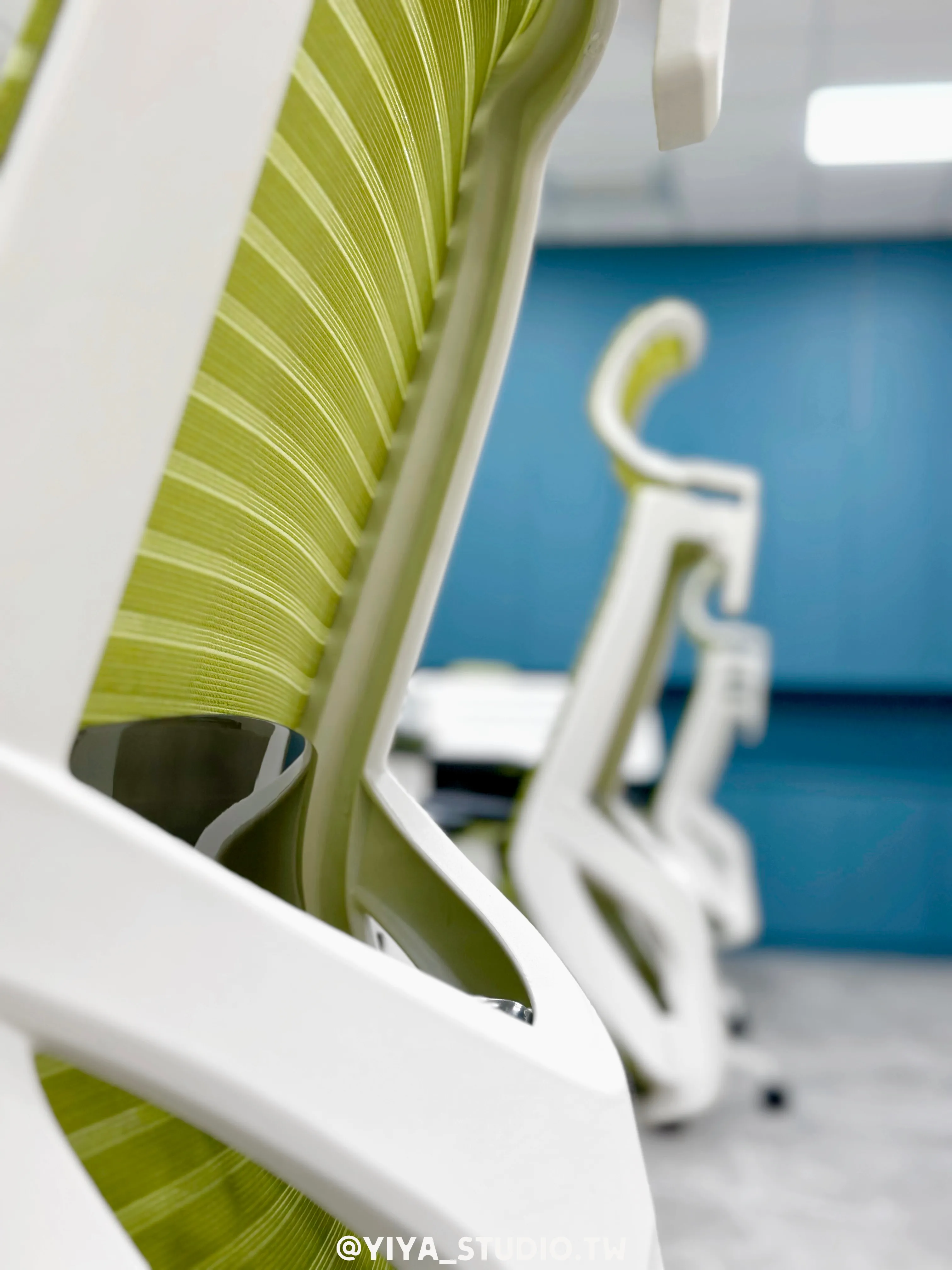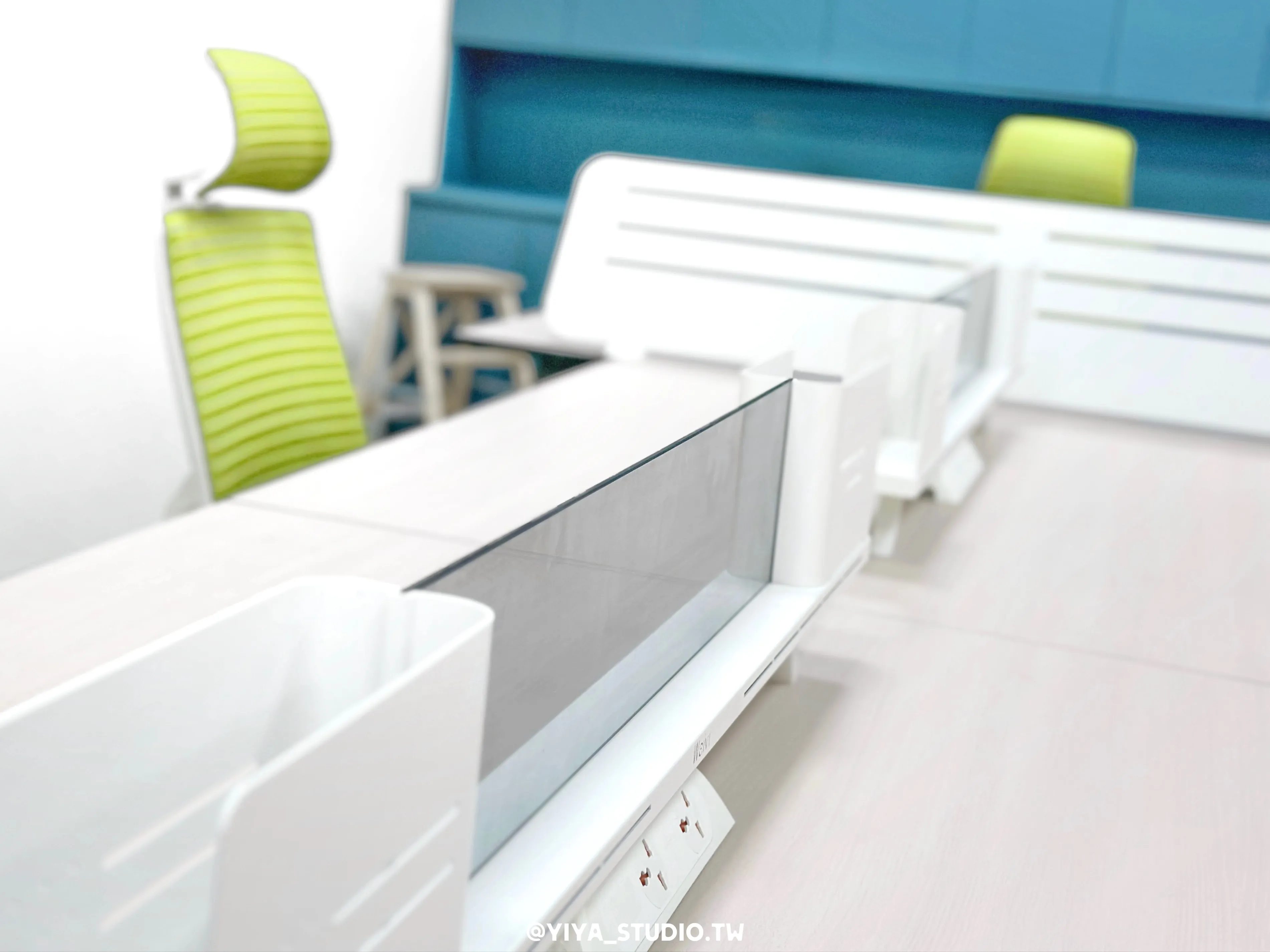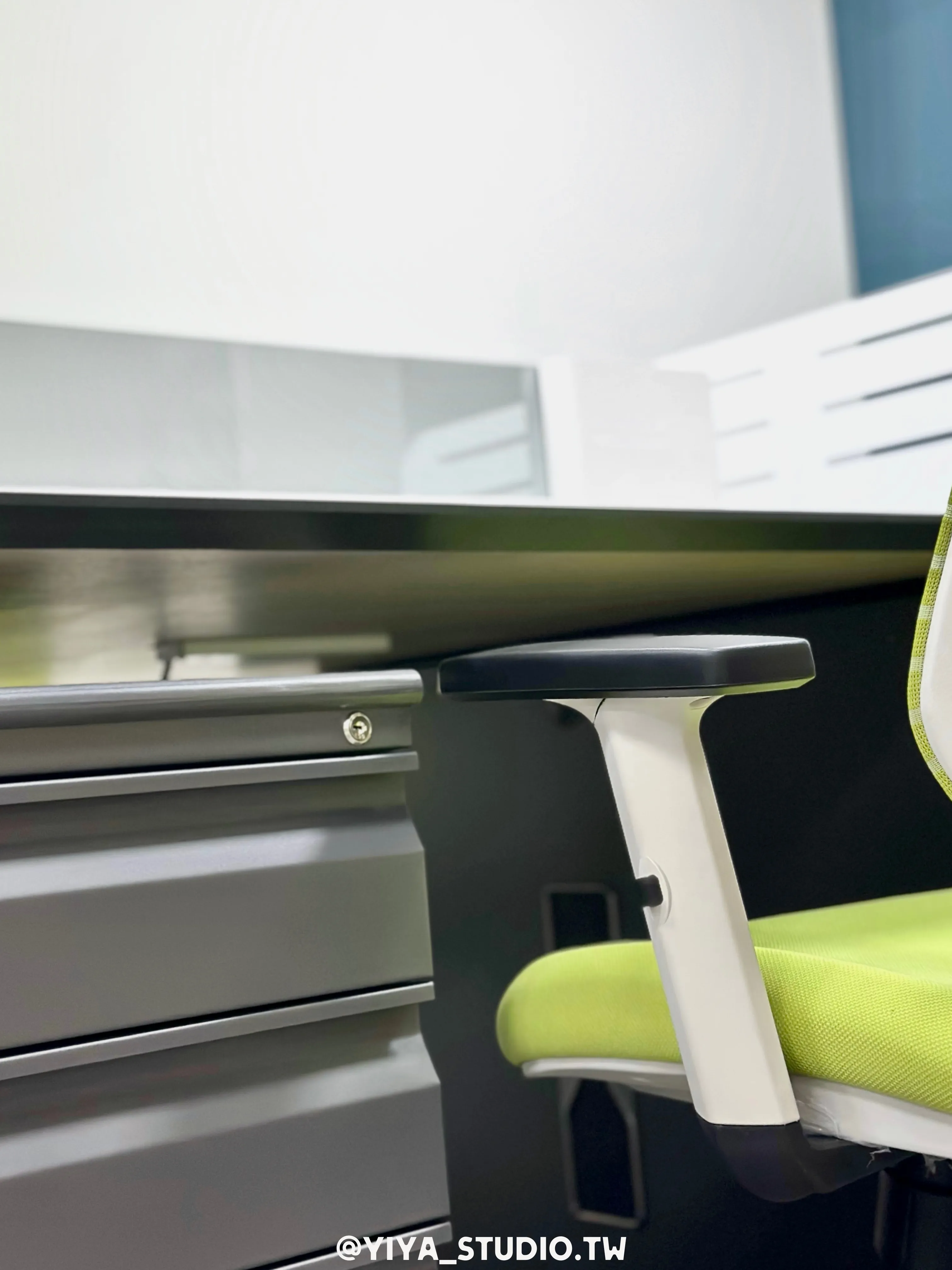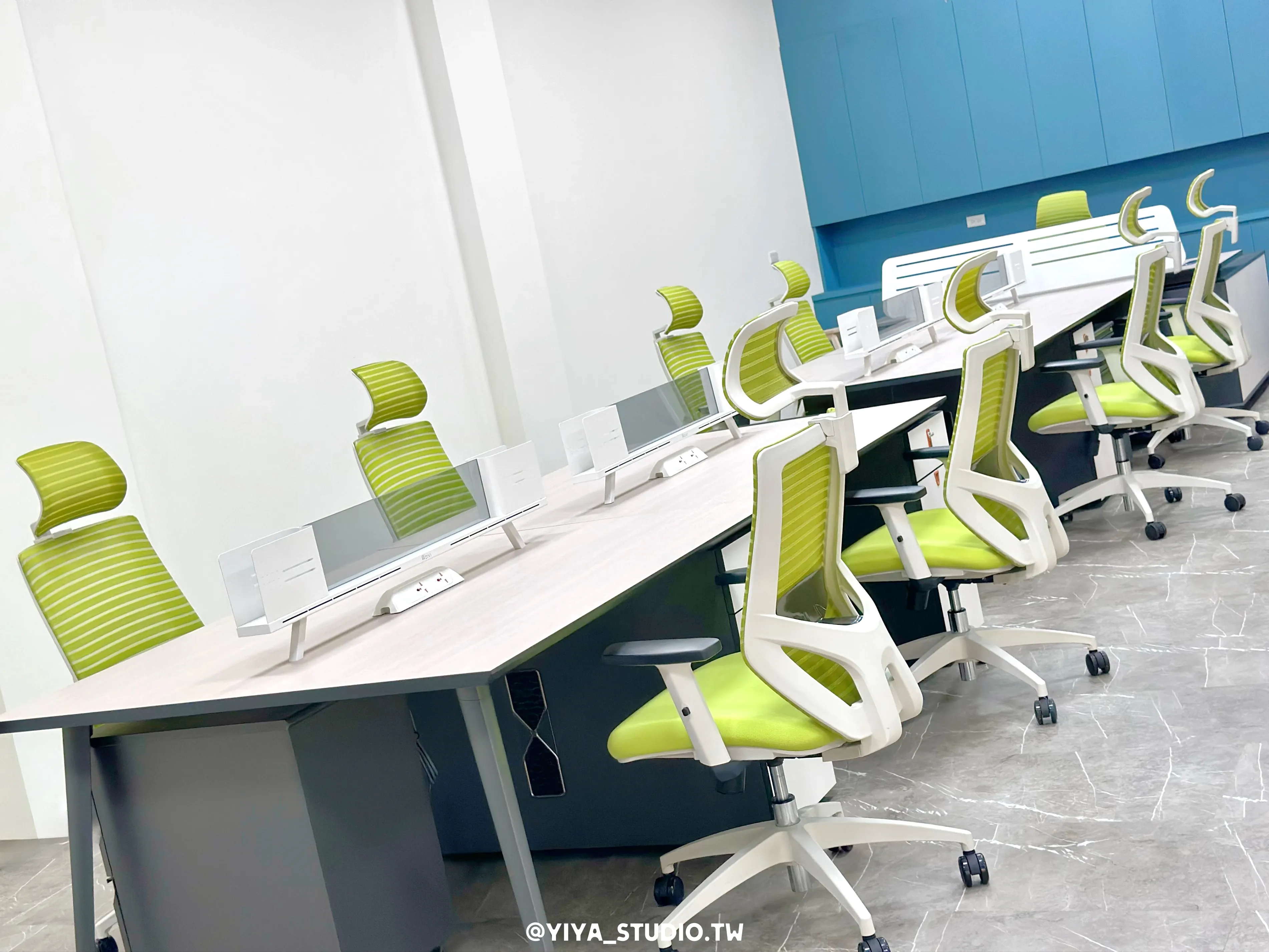 人體工學椅選用F-type系列,以綠色點綴空間視覺,提升長時間久坐的舒適度;主管桌與職員開放工作站採同系列設計,維持整體空間一致性。