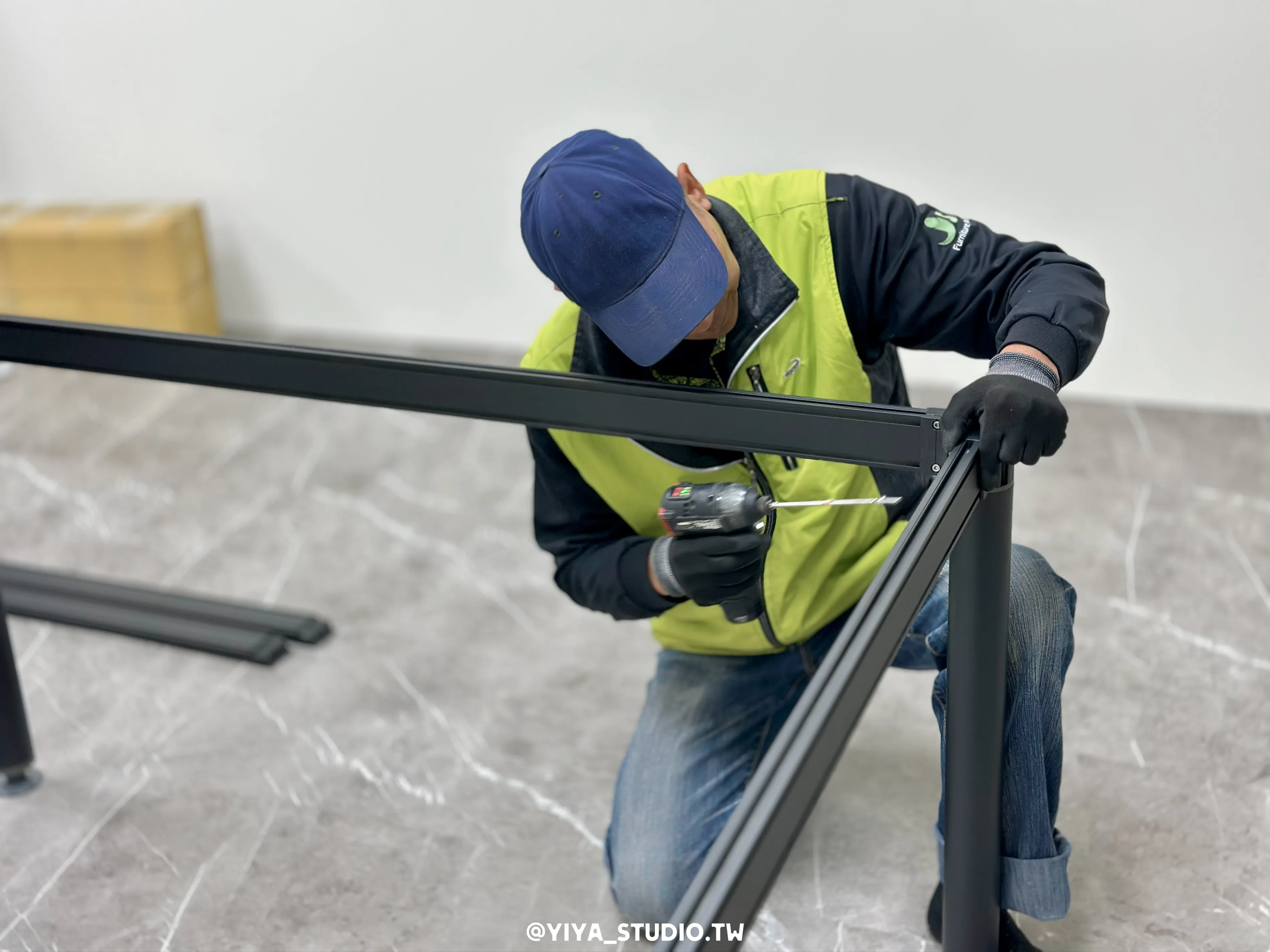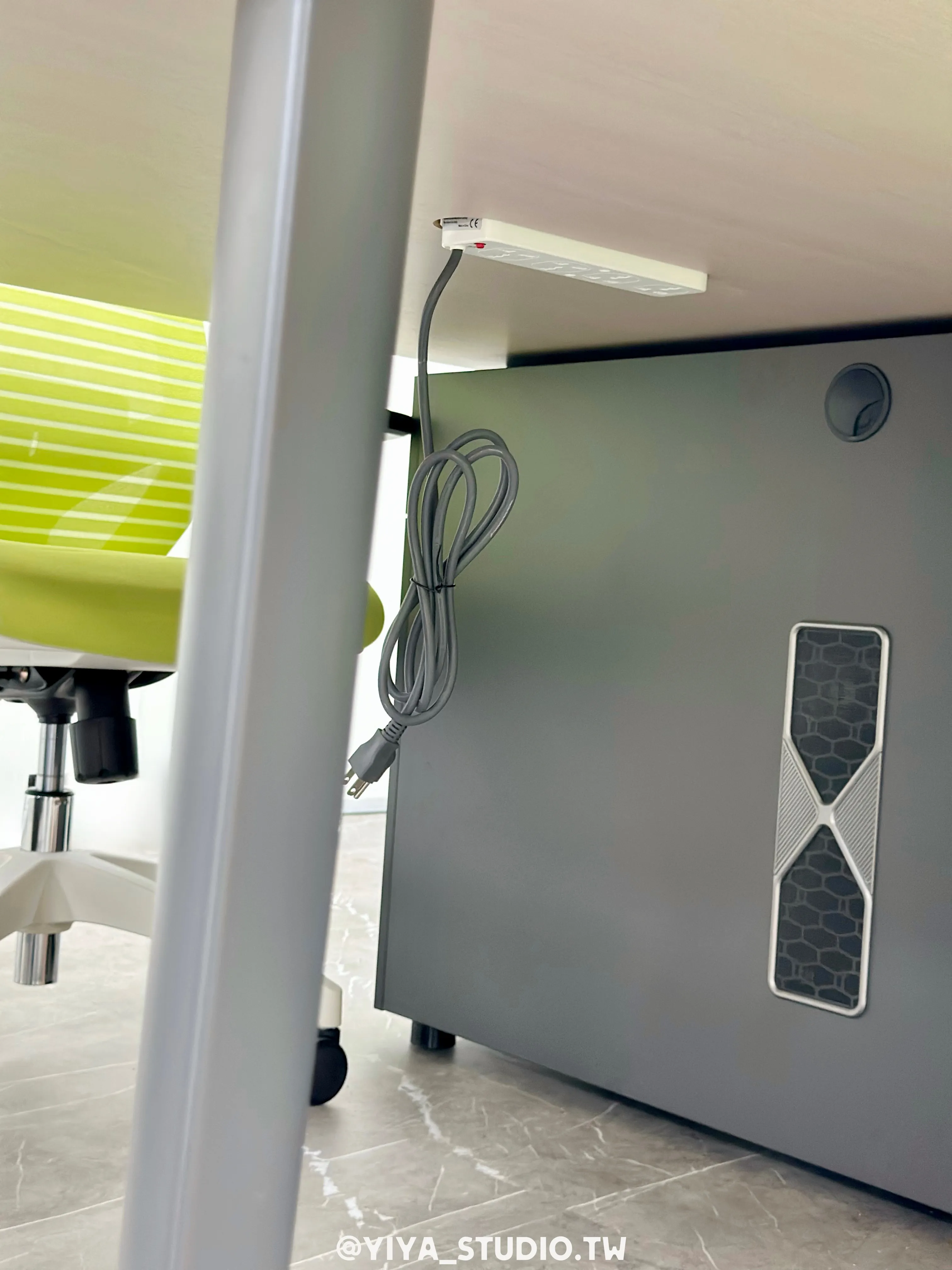 採用開放式工作站配置,營造明亮清爽的工作環境;桌面選用冰楠木紋搭配鐵灰色桌腳,呈現穩重且富層次的質感,並配置玻璃桌上隔屏與標配電腦置物櫃,兼顧視覺通透與實用機能。