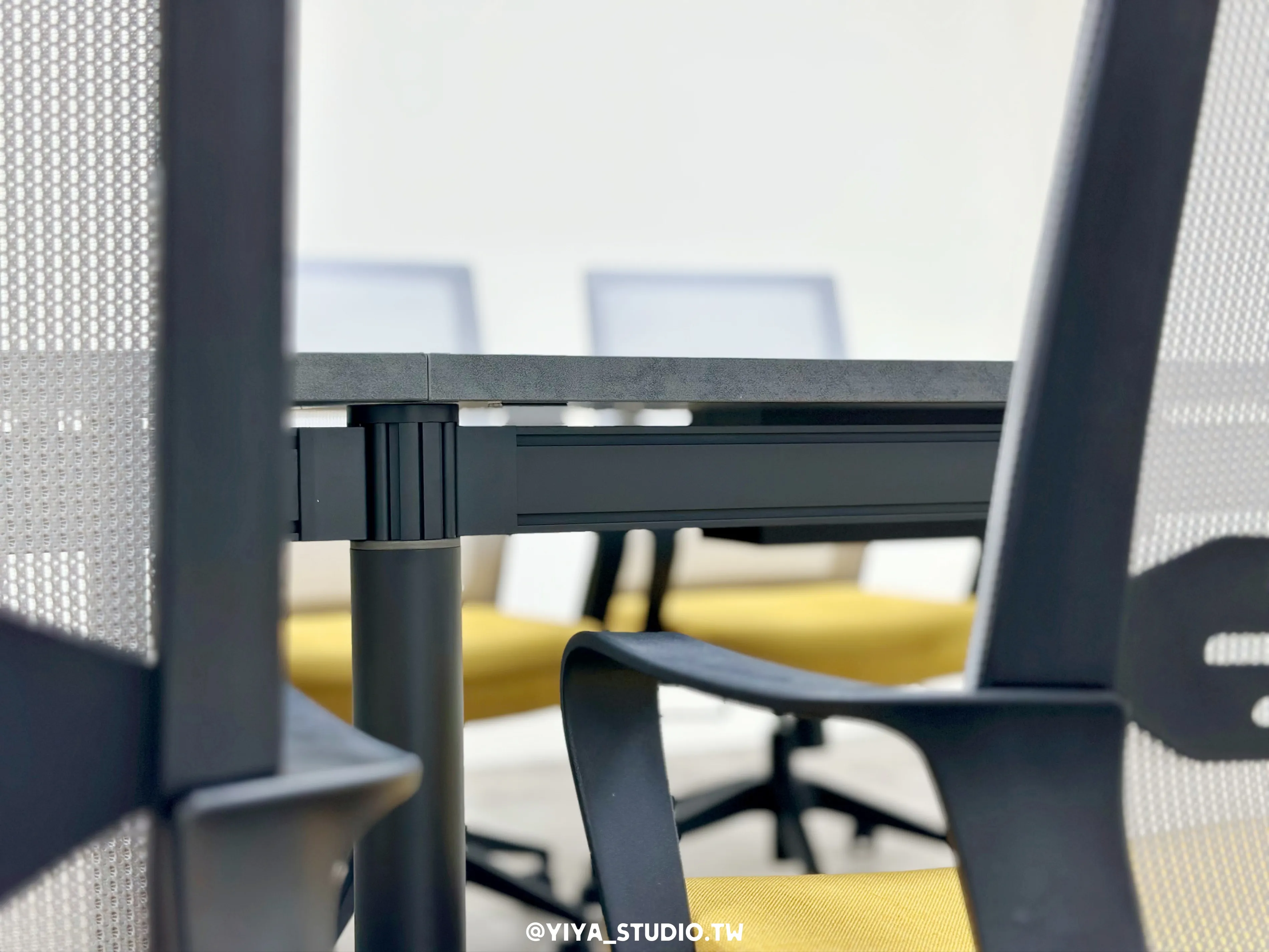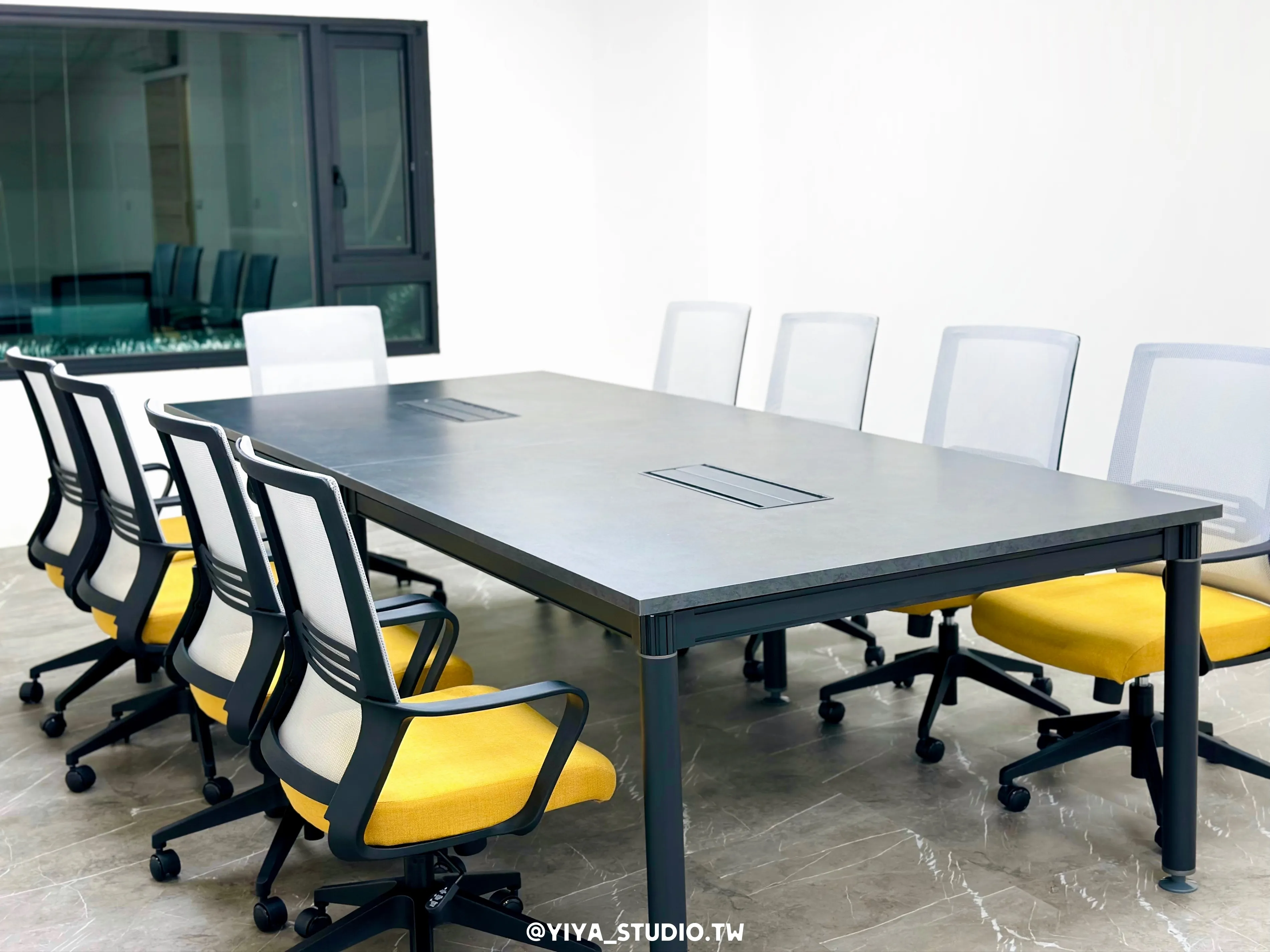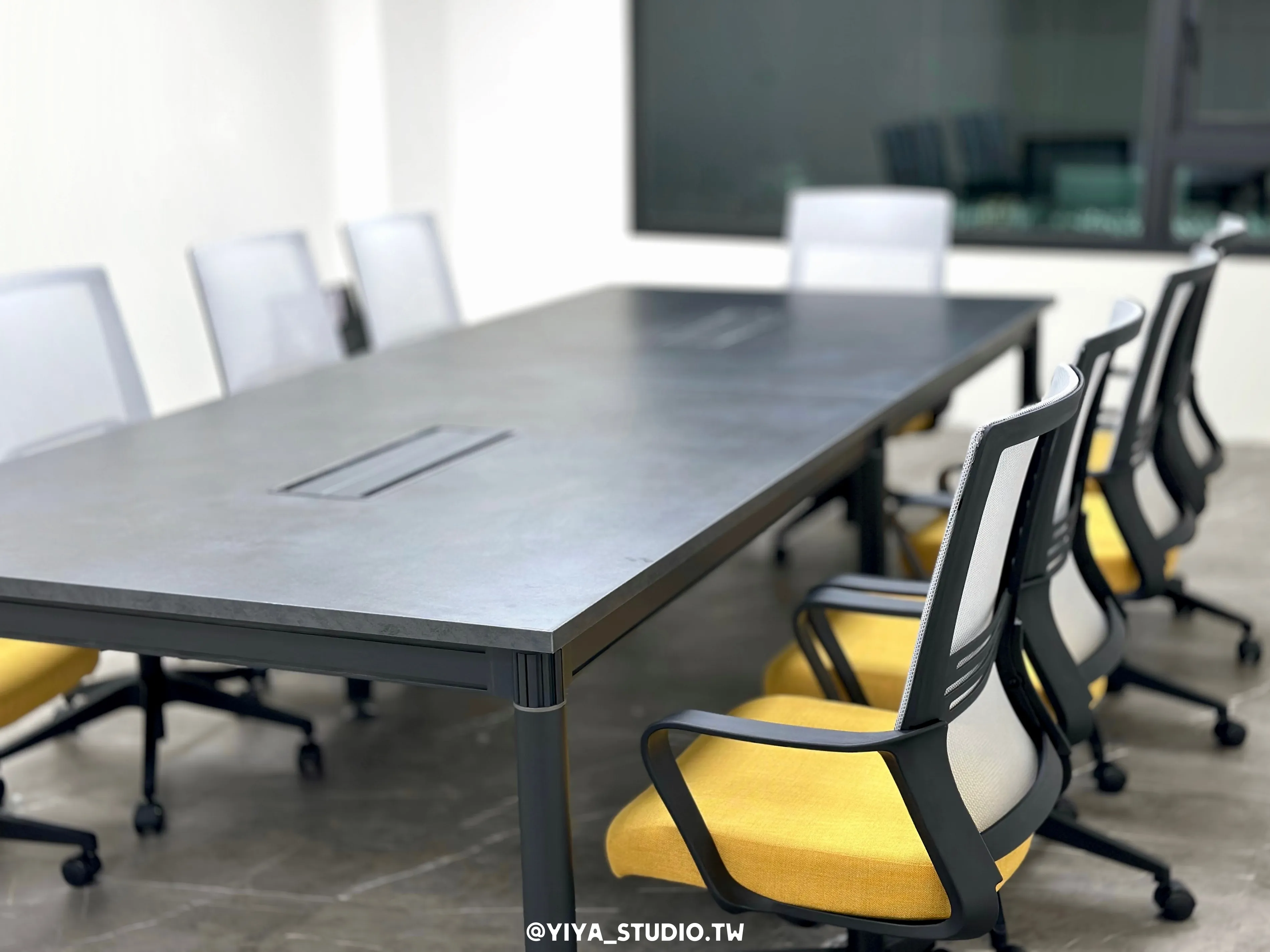 配置大型會議桌,桌板厚度達5cm,搭配C60桌腳與深灰色系桌面,展現沉穩大器的尺度感,作為重要會議的核心場域。